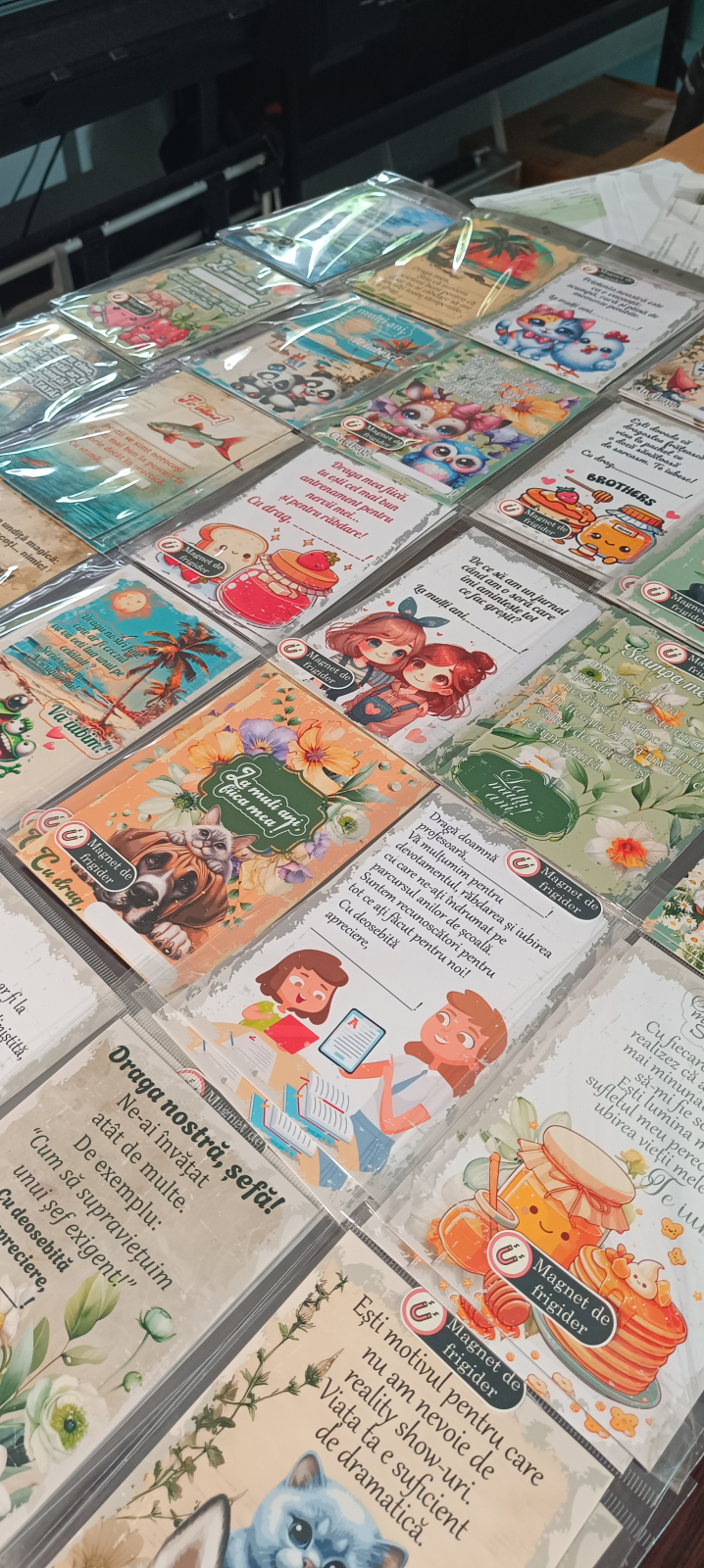 Felicitările sunt imprimate pe hârtie magnetică de înaltă calitate, care se prinde ușor de orice suprafață metalică. Printul digital inkjet asigură culori vibrante și durabilitate, astfel încât felicitarea să reziste testului timpului fără să-și piardă farmecul.